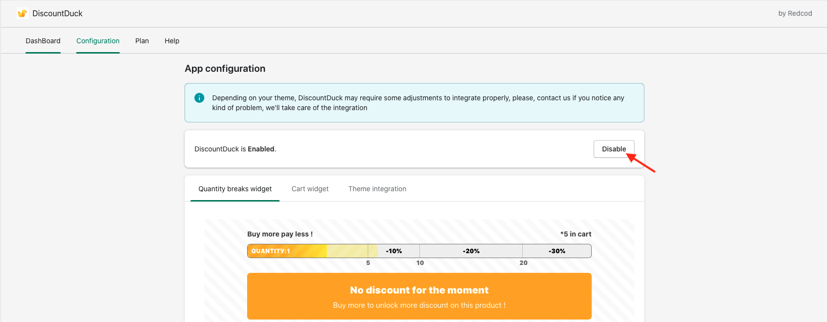 To disable DiscountDuck, go to the configuration page of DiscountDuck and click on Disable.