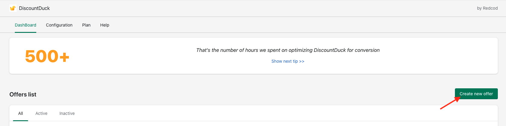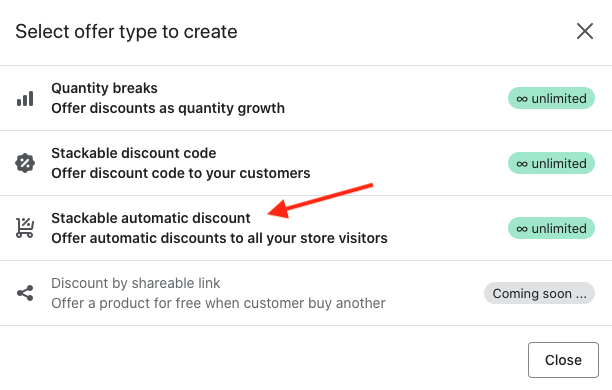 To create a stackable automatic discount, go to the dashboard, click on "Create new offer" and then on "Stackable automatic discount".