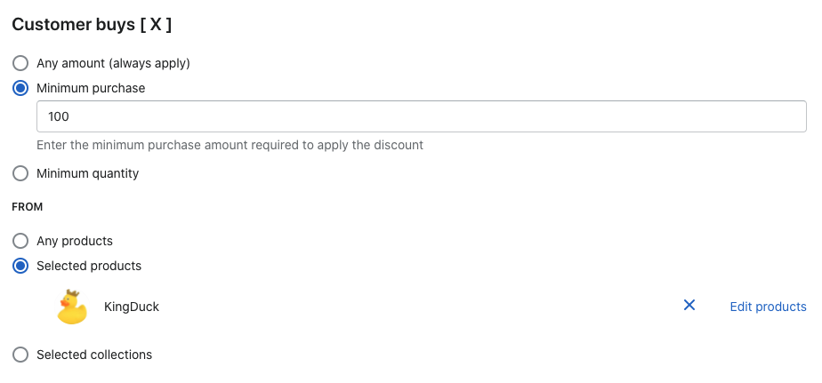 You can also choose which products will be used to validate the condition, you can choose to apply on any products, selected products or collections.