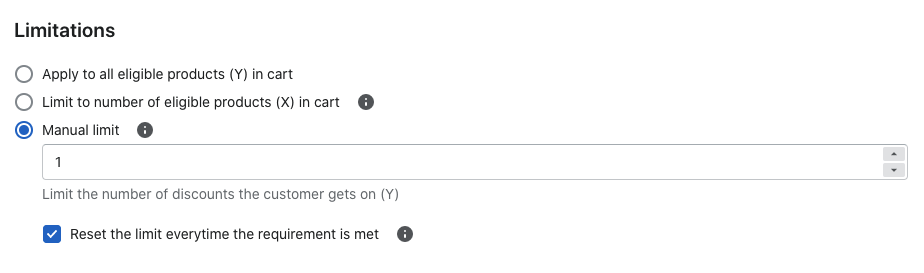 - Manual limit : manually limit the number of discounts to apply. can be used to create offers like "Buy 3 get 2 for free".