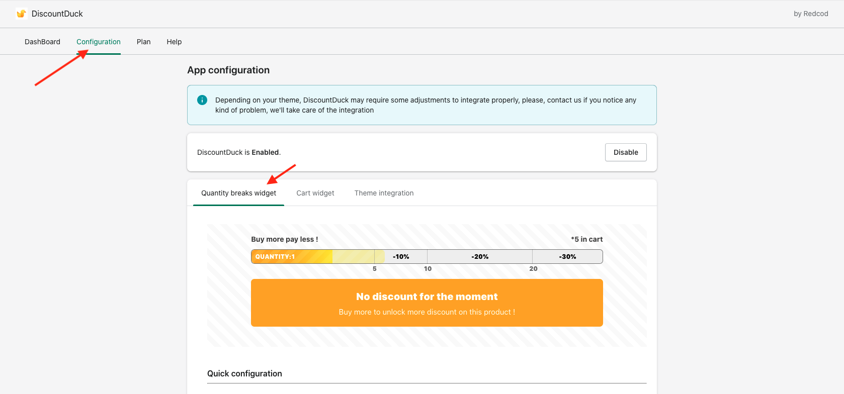 Open the configuration page of DiscountDuck and click on "Quantity breaks widget".
