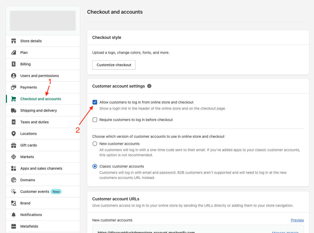2.Go to "Checkout and accounts" and check the option "Allow customers to log in from online store and checkout"